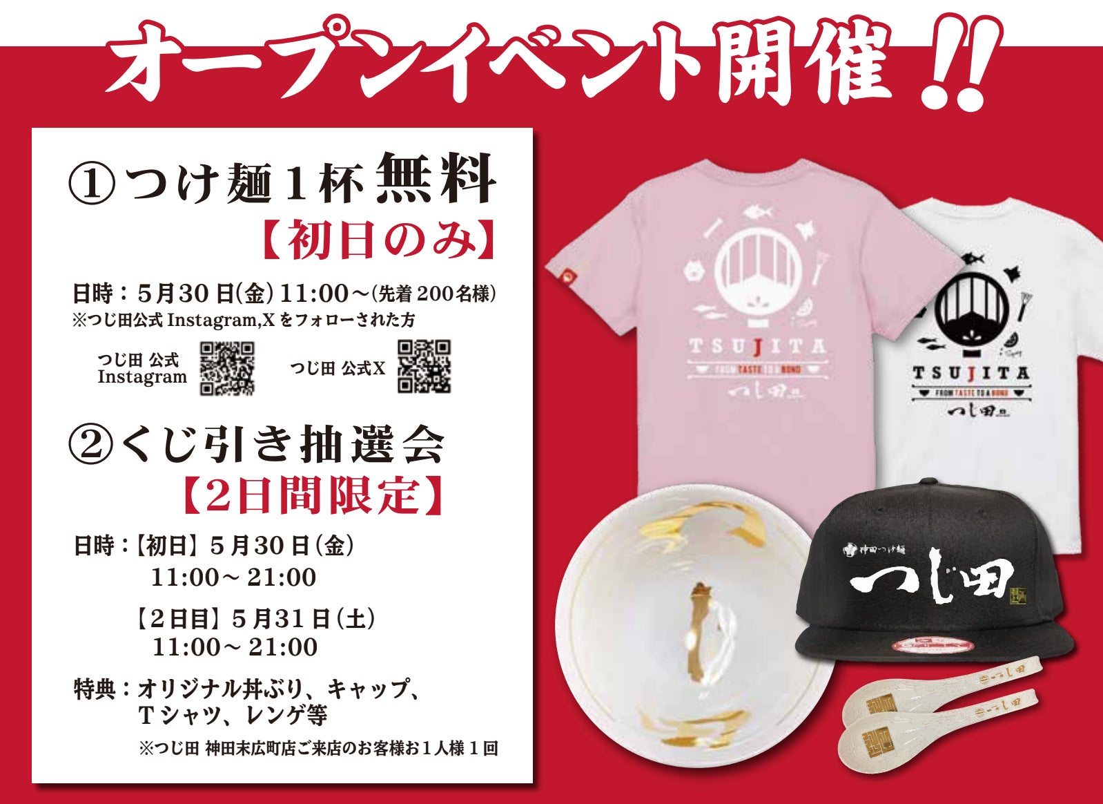 オープン当日は、「つじ田」公式SNSをフォローいただいたお客様に、看板メニューの一つである「濃厚つけ麺」を無料で振る舞うオープンイベントも実施いたします。
